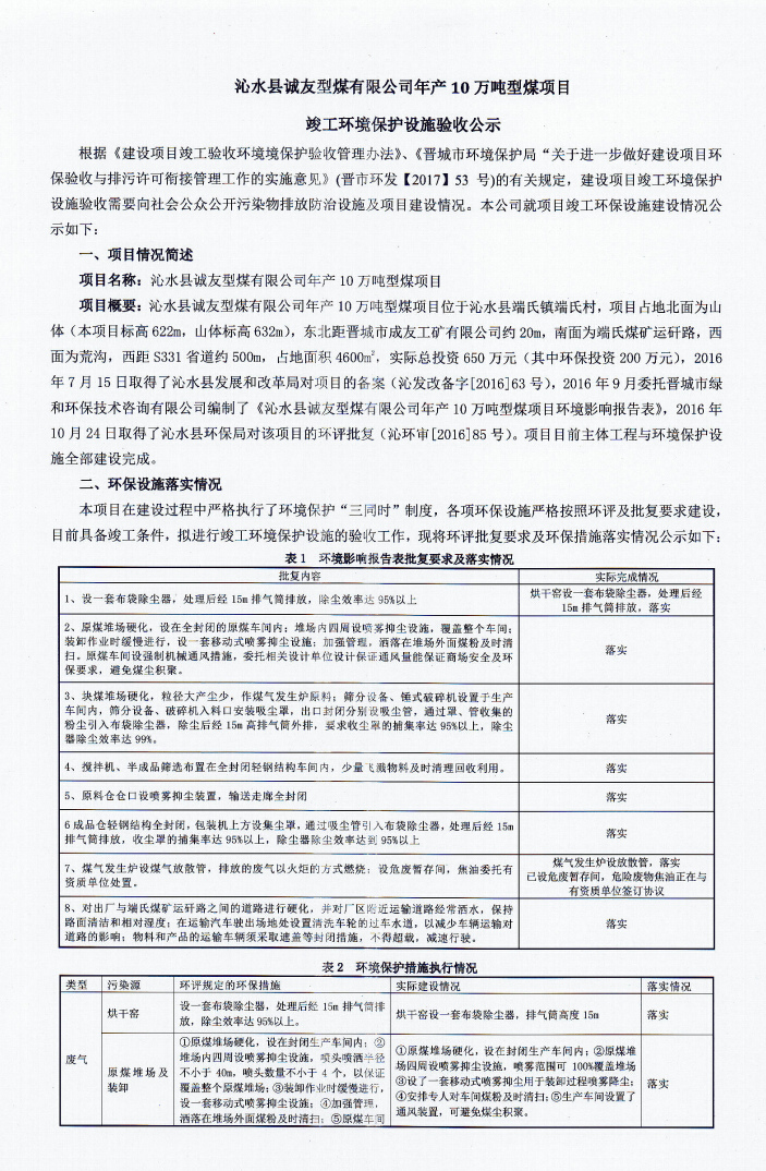 沁水縣誠友型煤有限公司年產10萬噸型煤項目竣工環境保護設施驗收公示